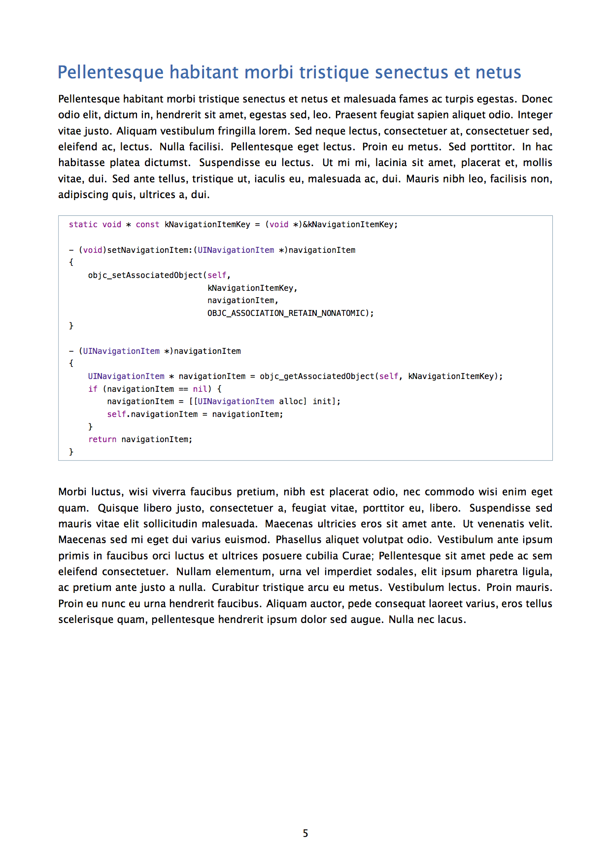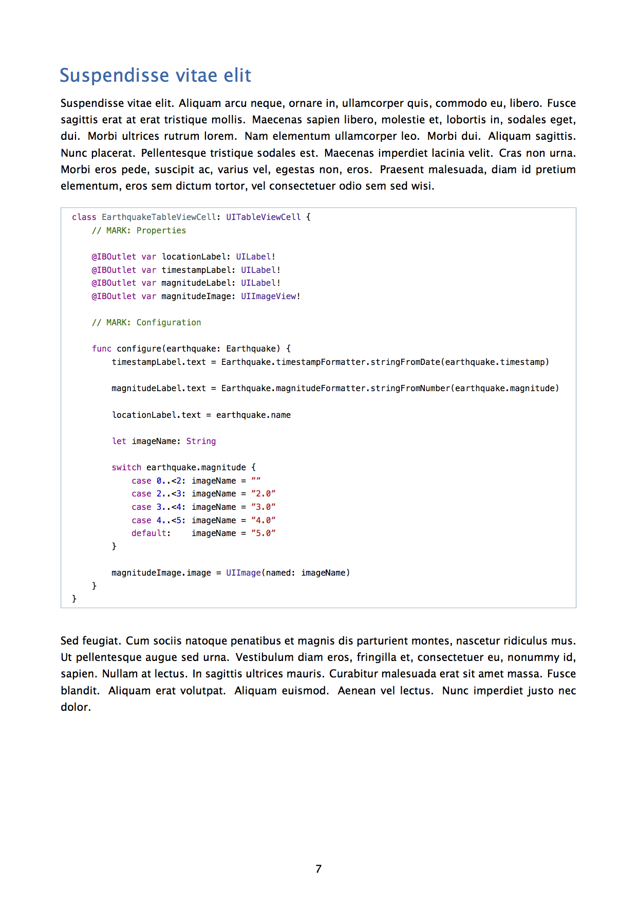 - code listings with syntax highlighting for Swift and Objective-C