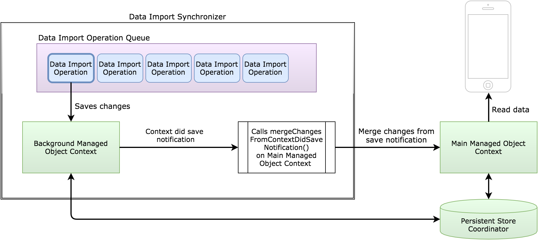 Data Import Synchronizer manages Data Import Operation Queue. The queue can execute only one Data Import Operation at a time. Each operation saves Background MOC, thereby saving changes to Persistent Store. Once the save is done Background MOC posts NSManagedObjectContextDidSave. The notification is received by Data Import Synchronizer which calls mergeChanges(fromContextDidSave:) on Main MOC, in result keeping both context in sync.